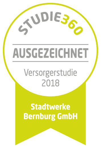 Die Stadtwerke Bernburg GmbH hat die Prämierung "Ausgezeichnet" von der Versorgerstudie 2018 verliehen bekommen. Das Siegel der STUDIE360 kennzeichnet transparente und faire Energieversorger. Mit einem Ergebnis von 96% setzt der Energieversorger aus Bernburg vorbildliche Maßstäbe in der Energiewirtschaft und bietet faire und transparente Vertragskomponenten. Die Stadtwerke Bernburg GmbH wird den Nutzern des Verbraucherportals www.studie360.de nun empfohlen und darf sich als fairer und transparenter Energieversorger ausweisen.