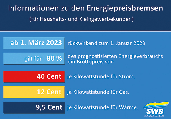 Grundsätzlich werden die Energiepreisbremsen entsprechend den gesetzlichen Vorgaben wie folgt umgesetzt: aus der aktuellen Jahresverbrauchsprognose und der Differenz aus Preisdeckel (Referenzpreis) und aktuellem Vertragspreis errechnet sich der Entlastungsbetrag für das Jahr 2023.
